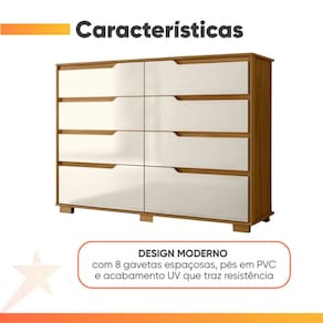 DIFERENCIAL: 8 gavetas espaçosas com puxadores modernos em estilo Cava, amplo espaço interno, acabamento em pintura UV que dá mais resistência e durabilidade.