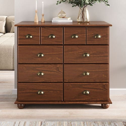 Com visual retrô e acabamento sofisticado em Castanho Verniz, A Cômoda de Madeira Maciça 8 Gavetas Colmar é a união perfeita entre organização e elegância. São 08 gavetas funcionais, sendo 4 amplas e 2estreitas, ideais para roupas, acessórios e objetos diversos. Os puxadores metálicos dourados em formato concha reforçam o charme clássico, enquanto os pés torneados e a estrutura robusta em madeira trazem presença marcante ao ambiente. Um Organizador compacto, versátil e atemporal, perfeito para quartos, closets ou halls com estilo e personalidade.