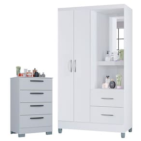 Cômoda 867 4 Gavetas com Guarda Roupa Solteiro Córdoba 2 Portas Branco Brilho - Poquema
