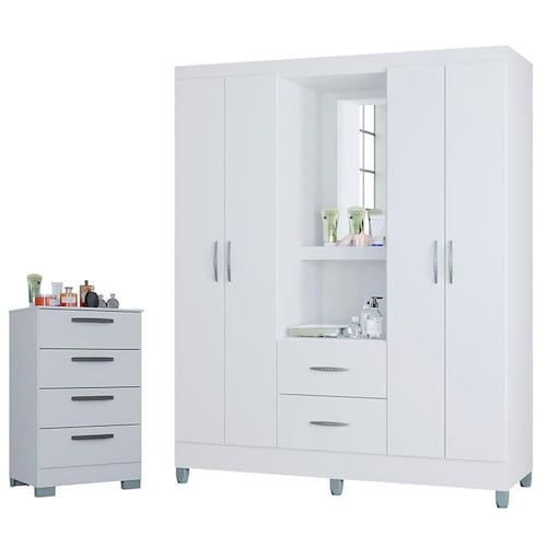 Começou a procurar móveis para seu quarto? Apresentamos para você este belo conjunto composto pela cômoda da linha 867 e o guarda roupa da linha Córdoba. A cômoda conta com quatro gavetas que deslizam suavemente com corrediças metálicas. Já o guarda roupa possui quatro portas oferecendo amplo espaço interno, além de duas gavetas, também com corrediças metálicas. Acompanhando espelho dando o destaque. Tanto a cômoda quanto o guarda roupa possuem puxadores e pés em plástico resistente garantindo mais estabilidade. Fabricados pela Poquema, são desenvolvidos em MDP combinando praticidade com durabilidade, sendo ideais para quem busca otimizar espaço com estilo e funcionalidade. Confira e aproveite!
