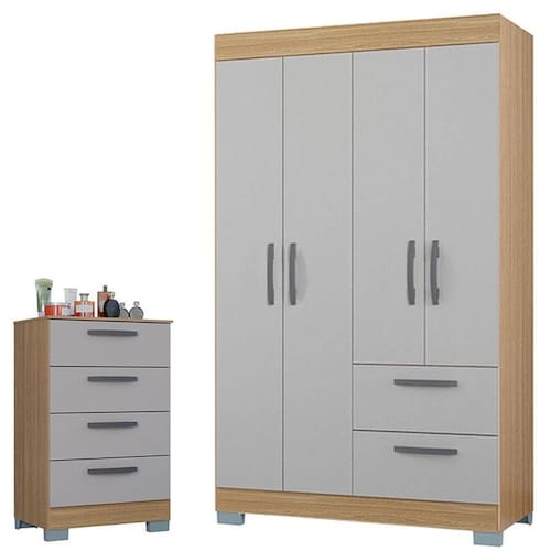 Começou a montar seu quarto? Então apresentamos para você este belo conjunto composto pela cômoda da linha 867 e o guarda roupa da linha Tóquio. A cômoda possui quatro gavetas com um ótimo espaço interno, possui corrediças metálicas proporcionando um deslizamento suave. Puxadores e pés em plástico agregam um design moderno. Complementando o conjunto, o guarda roupa contém quatro portas otimizando o espaço interno, perfeito para acomodar suas roupas e acessórios. Inclui duas gavetas com corrediças metálicas garantindo mais praticidade. Os puxadores e pés em plástico complementam o design. Fabricados pela Poquema, são desenvolvidos em MDP com um excelente acabamento sendo uma ótima escolha para quem busca uma solução completa para a organização do quarto, com móveis duráveis e design clean. Confira e aproveite!