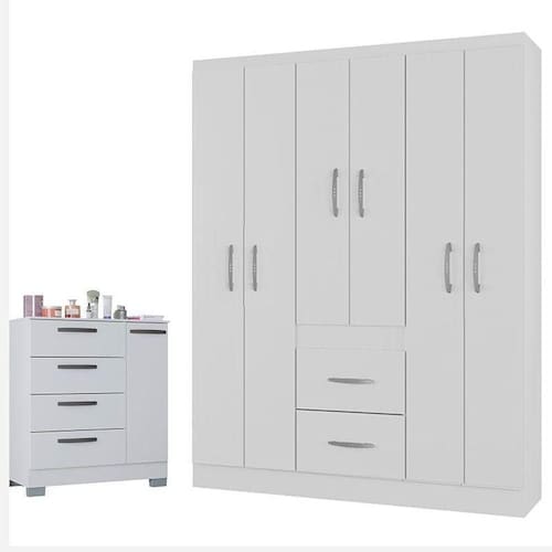 Cômoda 868 4 Gavetas e 1 Porta com Guarda Roupa Casal Milão 6 Portas Branco Brilho - Poquema