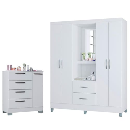 Está montando seu quarto? Então apresentamos para você este belo conjunto composto pela cômoda da linha 868 e o guarda roupa da linha Córdoba. A cômoda possui quatro gavetas espaçosas equipadas com corrediças metálicas proporcionando um deslizamento suave. Além disso, conta com uma porta lateral aumentando o espaço. Já o guarda roupa vem com quatro portas e duas gavetas, assim como a cômoda com corrediças metálicas. Acompanha espelho, trazendo mais praticidade. Os puxadores e os pés tanto da cômoda quanto do guarda roupa são em plástico resistente, o que contribui para a durabilidade. Fabricados pela Poquema, são desenvolvidos em MDP oferecendo uma combinação perfeita de praticidade, resistência e estilo, ideal para compor qualquer quarto. Confira e aproveite!