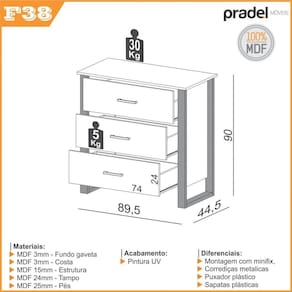 A Pradel traz a cômoda F38 JPF na cor Freijó com preto fosco. O móvel conta com 3 gavetas trazendo conforto na hora de organizar seu quarto. Com estrutura 100% MDF, incluindo os pés e pintura UV, a qualidade, durabilidade e resistência estão garantidos. Acabamento da Gaveta: Pintura UV Ambiente Principal: Quarto Complexidade da Montagem: Média: pode ser montado por mais de uma pessoa e/ou necessite de maior conhecimento para montagem Cor: Freijó/Preto Fosco Cor do Produto: Freijó/Preto Fosco Escala de Brilho: Fosco Escala de Brilho da Gaveta: Fosco Gaveta com Chave: Não Itens Inclusos: 1 Cômoda, kit ferragens e manual de montagem Manual de Montagem e Instalação: https://cdn2.madeiramadeira.com.br/atributo/pradel-m-veis/828612-f38.pdf Material da Gaveta: MDF Material do Fundo: MDF Material do Puxador da Gaveta: Plástico Material dos Pés: MDF Material Principal: MDF Necessita Montagem: Sim Origem do Produto: Nacional Peso: 34,5 kg Peso Máximo por Gaveta: 5 kg Possui Espelho: Não Possui Nichos: Não Possui Pés: 04 Possui Portas: Não Possui Prateleiras: Não Possui Rodízio: Não Recomendações de Uso, Manutenção e Limpeza: Utilizar somente um pano levemente umedecido e em seguida passe um pano seco. Produtos químicos ou abrasivos podem acabar danificando o acabamento do móvel. Sapatas Niveladoras: Não Sistema de Montagem: Montagem com minifix Suporta Até (kg): 30 kg Tamanho: Tipo de Corrediça da Gaveta: Metálica Simples Tipo de Puxador da Gaveta: Externo