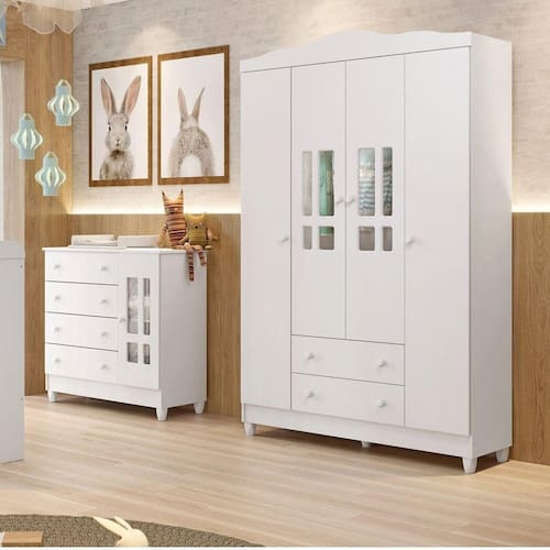 Quer manter o quarto do seu baby organizado, mantendo o estilo de conforto e delicado do quarto? Então você achou o que procurava. A Carolina Baby desenvolveu o Guarda-Roupa Ariel 4 portas pensando em você e no seu bebê. Ele foi desenvolvido com o corpo em MDP, com as portas e gavetas em MDF de alta resistência mecânica, que permite que as gavetas tenham movimentos de abrir e fechar mais suaves sobre as corrediças metálicas e possui também, travas de segurança.