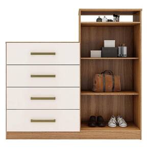 A Cômoda Áurea é elegante que complementa o ambiente e oferece muita praticidade. Com quatro gavetas espaçosas e um armário de duas portas com duas prateleiras internas, espaço para acomodação de roupas e objetos não será um problema. Ainda conta com um nicho na parte superior para itens menores ou objetos de decoração. Com puxadores na cor bronze, sua fabricação é feita em MDP de alto padrão, com acabamento resistente, proporcionado por sua pintura UV.