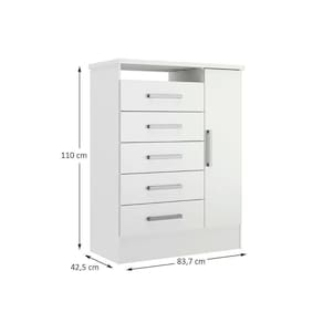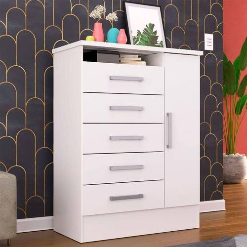 Com a Comoda Aurora Rodial voce podera ter a elegancia e a funcionalidade que tanto procura em um unico movel! Com 5 gavetas espacosas e uma porta de abrir, essa comoda oferece um espaco amplo e organizado para guardar suas roupas e acessorios.