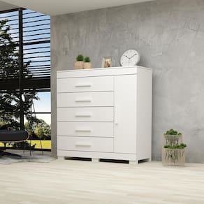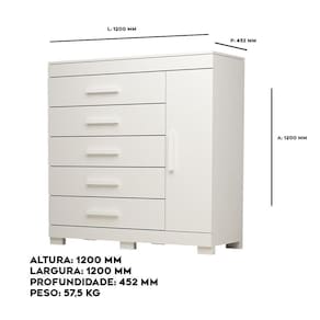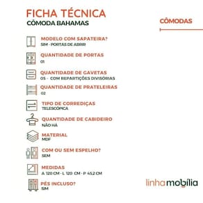 Desfrute da elegância e praticidade da cômoda Bahamas, feita com 100% de MDF de alta qualidade. Com 5 gavetas equipadas com corrediças telescópicas suaves, você terá acesso rápido e fácil aos seus pertences. Além disso, possui um espaçoso sapateiro integrado para manter seus calçados organizados. Os puxadores em MDF revestido complementam o design sofisticado, proporcionando um toque de estilo a cada detalhe. Experimente a combinação perfeita de funcionalidade e beleza com a cômoda Bahamas.