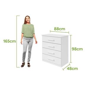 Características: Produto em MDP; Pintura U.V. e acabamento em micro textura; Puxadores em MDF; 04 gavetas; Gavetas com corrediças telescópicas; Tampo de 25mm; Fundo das gavetas e costas em HDF. Vantagens/Benefícios: Produzido com equipamentos de alta tecnologia; Produto avaliado e aprovado por um rigoroso controle de qualidade; Fácil montagem e manual de montagem simplificado; Design minimalista; Acabamento com toque aveludado; Gavetas ideais para acomodação das roupas em maiores quantidades; Gavetas grandes e espaçosas com corrediças telescópicas; Tampo de 25mm para maior resistência;