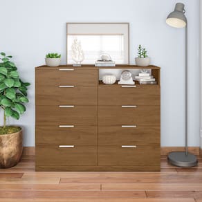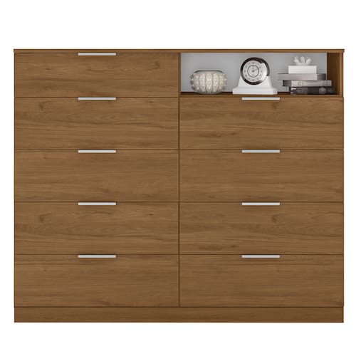 Além do mais, essa linda cômoda conta com corrediças metálicas para proporcionar um deslize muito mais suave, puxadores modernos em alumínio e um nicho, que pode ser usado para acomodar peças decorativas ou acessórios.