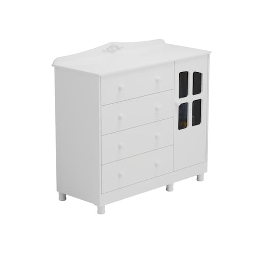 A Cômoda Elô 1 Porta é um produto 100% MDF e possui pintura atóxica. Seu caixote é em chapa de 12 mm, enquanto o tampo superior, as frentes e as molduras são em chapa de 15 mm. Seus pés são injetados em plástico de alta resistência e possuem altura regulável.Os puxadores são também em plástico. Possui cabideiro metálico, gavetas com corrediças telescópicas e portas com detalhe em PETG cristal. Acompanha um aplique decorativo de fixação opcional.