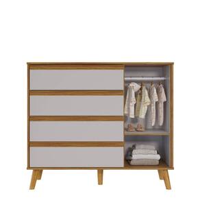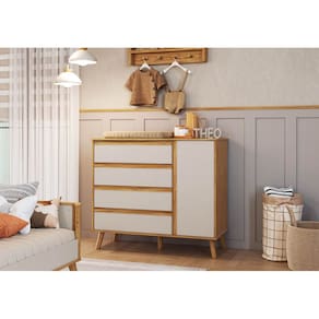 Fabricada em MDF , 04 gavetas e 01 porta , corrediças telescópicas, Pés em madeira, cantos curvados , puxadores cavas ,pintura atóxica, acabamento interno linho, sistema anti tombamento;
