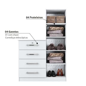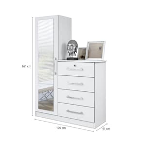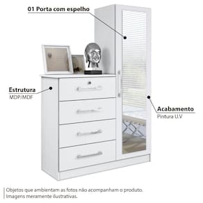 Características - Branco. - Estrutura: MDP/MDF. - Acabamento: Pintura UV texturizada. - 1 Porta com espelho. - 4 Prateleiras internas. - 4 Gavetas, 1 delas com chave. - Corrediças telescópicas. - Puxadores em MDF revestidos. - Tampo de MDF fresado de 15 mm.