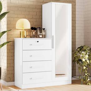 ESPECIFICAÇÕES: Estrutura em MDP Pintura UV Tampo de MDF usinado com pintura de borda 1 Porta Dobradiças metálicas 4 Gavetas Corrediças telescópicas 1 Gaveta com chave Prateleiras internas Puxadores em MDF revestidos Espelho parafusado na porta A x P: 120 x 0,3 cm Amplo espaço interno