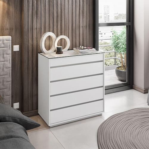 Funcional e elegante, a Cômoda Belize conta com tampo de vidro temperado de 8mm, que traz leveza e modernidade ao design. Para mais pde, oferece gavetas com corrediças telescópicas e uma colmeia organizadora na ira gaveta, perfeita para manter tudo no seu lugar com muito estilo.
