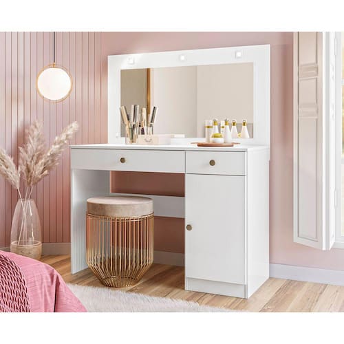 Características Estrutura em MDP de 15mm. Pintura em acabamento UV. 01 Porta articulada com dobradiças metálicas. 02 Gavetas com corrediças telescópicas. Gaveta maior com divisor. Painel com espelho. 03 Luminárias de LED. Puxadores na cor bronze.