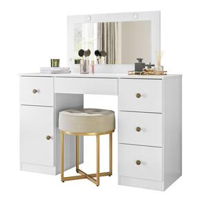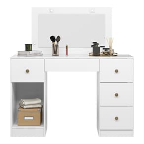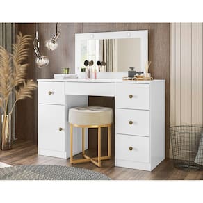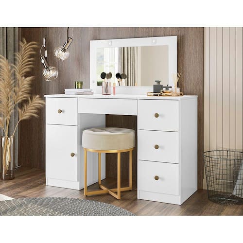 Características Estrutura em MDP de 15mm. Pintura em acabamento UV. 01 Porta articulada com dobradiças metálicas. 05 Gavetas com corrediças telescópicas. Gaveta central com divisor. Painel com espelho. 02 Luminárias de LED. Puxadores na cor bronze.