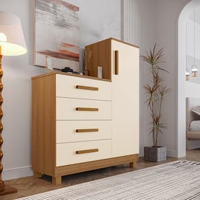 Produzida em MDP de alta qualidade e com acabamento em pintura UV, ela oferece resistência e um visual sofisticado para qualquer espaço da sua casa. Com 4 gavetas espaçosas com corrediças telescópicas, você tem muito mais praticidade e suavidade no dia a dia. Além disso, conta com um compartimento multiuso que pode ser como sapateira ou armário, ideal para quem busca versatilidade. Os puxadores e pés em PVC complementam o design com elegância e durabilidade, tornando este móvel uma excelente escolha para quartos ou salas compactas. A escolha certa para quem quer unir organização, estilo e funcionalidade em um só móvel.