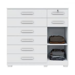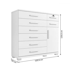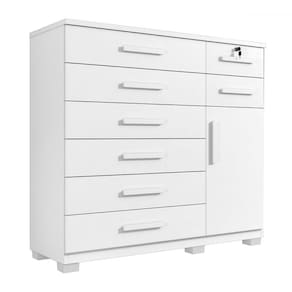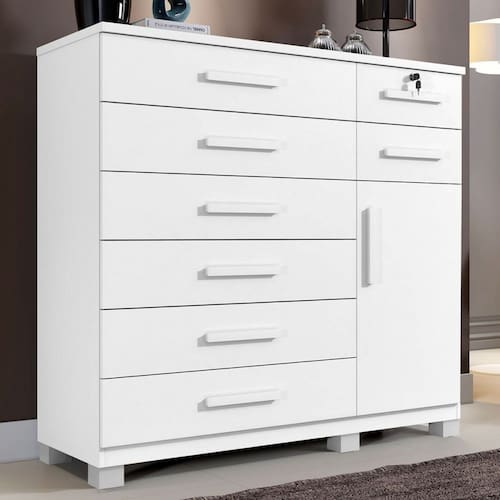 O(a) Cômoda Chicago 1 Porta 8 Gavetas Branco - Loja é produzido em MDP na escala de brilho Fosco, e possui um grau de dificuldade de montagem: Médio.