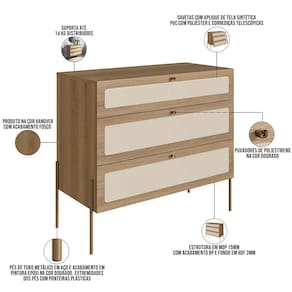 03 gavetas com corrediças telescópicas e aplique de tela sintética (PVC com poliéster).