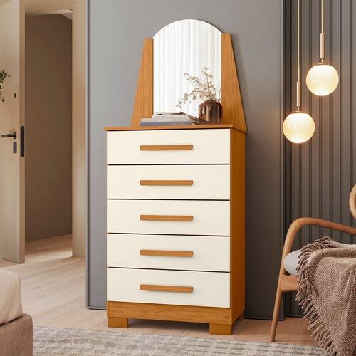 A Cômoda New Veneza combina design elegante e praticidade! Conta com 5 gavetas espaçosas com corrediças telescópicas para um deslizamento suave. Os puxadores de MDF revestidos garantem sofisticação, e o espelho com topo curvo adiciona um toque refinado ao ambiente. Perfeita para organizar com estilo! Produto Montado: Sim Acabamento da Gaveta: Pintura UV Altura do Espelho: 59 cm Altura dos Pés: 5 cm Altura Máxima dos Pés: 5.0000 Ambiente Principal: Quarto codigo_ean: 7900288341723 Complexidade da Montagem: Alta: deve ser montado por um montador especializado Cor: Cinamomo / Off White Cor do Produto: Cinamomo / Off White Escala de Brilho: Semi-Brilho Escala de Brilho da Gaveta: Semi-Brilho Espessura do Espelho: 3 mm Formato do Espelho: Retangular Gaveta com Chave: Não Itens Inclusos: 01 Comoda e 1 Manual de Montagem Largura do Espelho: 39 cm Linha ou Coleção: Albatroz Manual de Montagem e Instalação: https://product-hub-prd.madeiramadeira.com.br/270263535/documents/71cf6155-f785-4286-8881-9c854284e381b8270626767517401433622778.pdf Marca: Albatroz Móveis Material da Gaveta: MDP Material do Fundo: HDF Material do Puxador da Gaveta: MDF Material dos Pés: ABS Material Principal: MDP Necessita Montagem: Sim Origem do Produto: Nacional Peso: 27 kg Peso Máximo por Gaveta: 5 kg Possui Espelho: Sim Possui Nichos: Não Possui Pés: 04 Possui Portas: Não Possui Prateleiras: Não Possui Rodízio: Não Quantidade de Espelho: 01 Quantidade de Gavetas: 05 Gavetas Recomendações de Uso, Manutenção e Limpeza: Limpar com flanela ou pano macio seco, não utilizar produtos abrasivos, desengordurantes, álcool ou solvente. Não expor o produto diretamente á luz solar e á umidade. Sapatas Niveladoras: Sim Sistema de Montagem: Parafusos, cavilhas e minifix Suporta Até (kg): 35 kg Tipo de Cômoda: Adulto Tipo de Corrediça da Gaveta: Metálica Telescópica Tipo de Fixação do Espelho: Molduras Tipo de Puxador da Gaveta: Externo