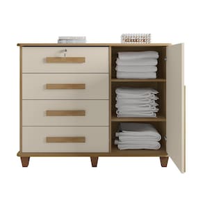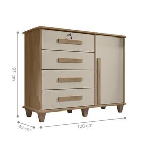 Com 4 gavetas de corrediças metálicas possui acabamento interno em linho, e puxadores em madeira nas gavetas e na porta, que conta também com dobradiças metálicas.