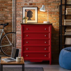 Cômoda Amsterdã conta com 5 gavetas com corrediça telescópica e puxadores metálicos, feita em madeira maciça de reflorestamento, com acabamento em verniz acetinado em tons de madeira e laqueado em tons coloridos.