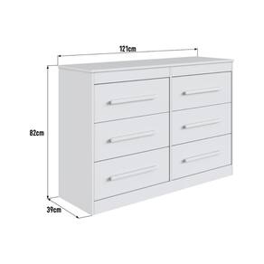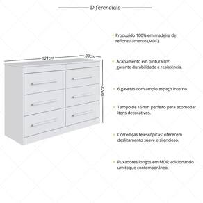 Amplo espaço e organização: São 6 gavetas (suportam até 5kg em cada) equipadas com corrediças telescópicas que promovem abertura completa e silenciosa. A combinação perfeita entre organização e praticidade para guardar roupas e acessórios com facilidade. Com puxadores longos em MDF, esta cômoda une funcionalidade e estilo, adicionando um toque contemporâneo ao espaço.