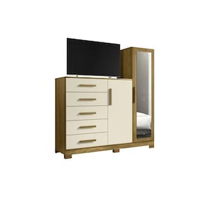 A cômoda New Master além de belíssima, é ideal para organização do seu quarto e de suas roupas. Ela possui 5 gavetas com corrediças telescópicas que proporciona mais abertura e resistência ao móvel, e 2 portas, sendo 1 com espelho. Seu tampo é de 15 mm e os puxadores são em MDF revestidos. Além disso tudo, ela possui espaço para eletrônico e apresenta uma versatilidade com opção de utilizar prateleira móvel ou cabideiro em seu espaço, você escolhe a opção que atenda a sua necessidade. Acabamento da Gaveta: Pintura UV Acabamento da Porta: Pintura UV Acabamento da Prateleira: Pintura UV Acabamento dos Pés: Pintura Altura do Espelho: 70 cm Altura dos Pés: 5 cm Ambiente Principal: Quarto Complexidade da Montagem: Alta: deve ser montado por um montador especializado Cor: Carvalho Grife/ Off White Cor do Produto: Carvalho Grife/ Off White Cor Interna: Branco Escala de Brilho: Fosco Escala de Brilho da Gaveta: Fosco Escala de Brilho da Porta: Fosco Escala de Brilho da Prateleira: Fosco Espessura do Espelho: 3 mm Formato do Espelho: Retangular Gaveta com Chave: Não Itens Inclusos: 01 Cômoda e Manual de Montagem Largura do Espelho: 30 cm Linha ou Coleção: Albatroz Manual de Montagem e Instalação: https://cdn2.madeiramadeira.com.br/atributo/albatroz-moveis/915531-esquema-1105-comoda-new-master.pdf Material da Gaveta: MDP Material da Porta: MDP Material da Prateleira: MDP Material do Fundo: HDF Material do Puxador da Gaveta: MDF Material do Puxador da Porta: MDF Material dos Pés: ABS Material Principal: MDP Necessita Montagem: Sim Origem do Produto: Nacional Pés Reguláveis: Não Peso: 69,5 kg Peso Máximo por Gaveta: 5 kg Peso Máximo por Prateleira: 5 kg Possui Espelho: Sim Possui Nichos: Não Possui Pés: 06 Possui Portas: 02 Possui Prateleiras: 03 Possui Rodízio: Não Quantidade de Espelho: 01 Recomendações de Uso, Manutenção e Limpeza: Limpar com flanela ou pano macio seco, não utilizar produtos abrasivos, desengordurantes, álcool ou solvente. Não expor o produto diretamente à luz solar e à umidade. Sapatas Niveladoras: Não Sistema de Montagem: Parafusos, Cavilhas e Minifix Suporta Até (kg): 60 kg Tamanho: Tipo de Corrediça da Gaveta: Metálica Telescópica Tipo de Dobradiça/Corrediça da Porta: Metálica Tipo de Fixação do Espelho: Parafusos Tipo de Porta: Bater Tipo de Puxador da Gaveta: Externo Tipo de Puxador da Porta: Externo