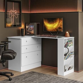 Funciona como cômoda com gavetas espaçosas, ideal para guardar roupas, acessórios, livros ou materiais de escritório. Quando necessário, sua mesa giratória com abertura de 90 oferece uma estação de trabalho ou estudo extra, perfeita para home office, setup gamer ou ambiente de estudos.