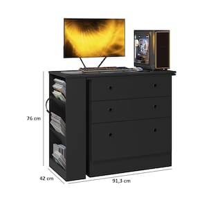 Estrutura em MDP Revestido em Pintura UV Abertura de 90° para melhor aproveitamento da mesa Rodízio na base para auxiliar a movimentação 03 gavetas sendo um gavetão com amplo espaço Prateleira lateral para acomodar livros e demais objetos Móvel multifuncional, podendo ser utilizado aberto como mesa ou fechado como cômoda.
