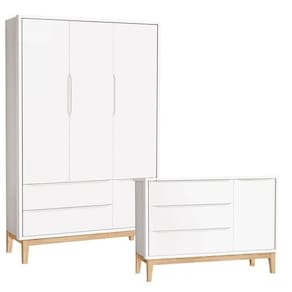 Cômoda com Porta e Guarda Roupa Infantil 3 Portas New Classic Branco com Pés Madeira Natural ? Reller
