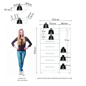 MEDIDAS DA CÔMODA: A = 171,6 cm L = 115,3 cm P = 46,8 cm MEDIDA DOS PÉS: A = 5 cm L = 10 cm P = 5 cm PESO: 82,5 Kg PESO SUPORTADO: 47 Kg GAVETAS SUPORTAM ATÉ: 3 Kg PRATELEIRAS SUPORTAM: 4 Kg CABIDEIRO SUPORTA: 5 Kg TAMPO SUPORTA: 10 Kg MODELO: Cômoda com Sapateira e cabideiro multiuso 5 Gavetas 1 Porta Imperial MARCA: Zanzini QUANTIDADE DE GAVETAS: 5 QUANTIDADE DE PORTAS: 1 TIPO DE PORTA: Bater QUANTIDADE DE PRATELEIRAS: 2 QUANTIDADE DE CABIDEIRO: 1 MATERIAL DO CABIDEIRO: Metal MATERIAL DE DOBRADIÇA: Metal MATERIAL DA ESTRUTURA: MDP ESPESSURA DO MATERIAL DA ESTRUTURA: 15 mm TIPO DE PINTURA: Semi fosco ACABAMENTO: UV Verniz QUANTIDADE DE PUXADORES: 6 MATERIAL DO PUXADOR: MDF TIPO DE PUXADOR: Parafusado CORREDIÇAS: Metálicas QUANTIDADE DE PÉS: 6 MATERIAL DOS PÉS: Plástico DIFERENCIAL: Puxadores em MDF; Gavetas espaçosas com divisórias e chave; Espaço para calçados ITENS INCLUSOS: 1 Cômoda, 1 Manual de Montagem, 1 Kit Parafusos SISTEMA DE MONTAGEM: Parafusos auto atarraxantes, cola, cavilhas, pregos, minifix GARANTIA: 3 Meses