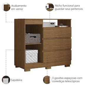 MEDIDAS:: A = 100 cm L = 97 cm P = 45 cm | MEDIDAS DOS PÉS:: A = 5 cm L = 9,5 cm P = 4 cm | PESO:: 36,05 Kg | PESO SUPORTADO:: 40 Kg | PRATELEIRA SUPORTA ATÉ:: 6 Kg | GAVETAS SUPORTAM ATÉ:: 5 Kg | NICHO SUPORTA ATÉ:: 4 Kg | MODELO:: Cômoda Com Sapateira Organizadora 3 Gavetas 1 Porta Lion | MARCA:: Aramóveis | PINTURA:: UV | ACABAMENTO:: Verniz | MATERIAL DA ESTRUTURA:: MDP | ESPESSURA DO MATERIAL DA ESTRUTURA:: 12mm e 15mm | PORTAS:: 1 | TIPO DE PORTA:: Bater | DOBRADIÇAS:: Metálicas | GAVETAS:: 3 | CORREDIÇAS:: Telescópicas | PRATELEIRAS:: 1 | NICHOS:: 1 | PUXADORES:: Modernos e em estilo cava | PÉS:: 6 | MATERIAL DOS PÉS:: ABS | DIFERENCIAL:: 3 gavetas espaçosas, 1 porta com espaço para calçados, 1 nicho, corrediças telescópicas, puxadores em estilo cava, acabamento em verniz alto brilho | ITENS INCLUSOS:: 1 Cômoda com Sapateira, 1 Manual de Montagem, 1 Kit Parafusos | INSTRUÇÕES E CUIDADOS:: Para maior durabilidade, recomendável que a limpeza dos móveis seja feita com pano limpo e levemente umedecido em água e sabão neutro. Em seguida, deverá ser passado um pano limpo e seco | GARANTIA:: 3 Meses | AVISO:: A Esplanada Móveis se responsabiliza pela dos produtos adquiridos até a porta de entrada ou portaria do endereço indicado, se a portaria do condomínio permitir, as s são efetuadas no piso térreo e é de responsabilidade do cliente. Cor: ATACAMA