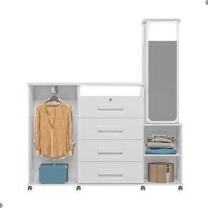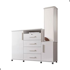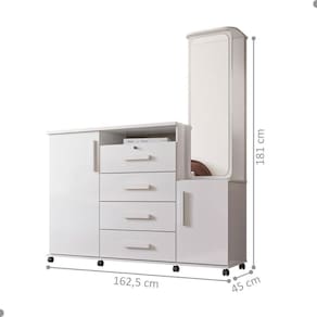 Contém puxadores cromados, trava na gaveta,espelho giratorio com porta objetos, cabideiro em aluminio, prateleira removível e rodízios.