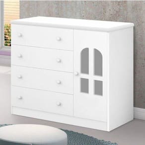 Cômoda de Bebê 1 Porta 4 Gavetas Alvin J&A Móveis Branco. Produto desenvolvido pensando nas mamães que buscam qualidade, segurança e beleza. É confeccionado com materiais resistentes para garantir a durabilidade e resistência ao produto, além de deixar o ambiente delicado e aconchegante. O tampo e frente das gavetas são feitos em MDF, gavetas com corrediças metálicas. Pintura em acabamento UV de composição não tóxica. Ean: 7899825806408