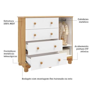 Cômoda produzida com estrutura 100% MDF e acabamento em pintura UV atóxica. Possui 1 porta com janela em PETG Cristal/Acrílico, que permitem visualizar parte interna do móvel, 4 gavetas que deslizam sob corrediças metálicas telescópicas, 1 prateleira que suporta até 5kg, puxadores e pés em plástico. Acompanham o produto, 2 opções de rodapés, um usinado (torneado) e outro reto, para que você escolha no momento da montagem qual se adequa ao estilo do ambiente. Aproveite para adquirir a sua agora! Produto Montado: Sim Acabamento da Gaveta: Pintura UV Acabamento da Porta: Pintura UV Acabamento da Prateleira: Pintura UV Altura dos Pés: 5.5 Altura Máxima dos Pés: 5.5000 Ambiente Principal: Quarto de Bebê codigo_ean: 7908709400967 Complexidade da Montagem: Média: pode ser montado por mais de uma pessoa e/ou necessite de maior conhecimento para montagem Cor: Branco Brilho/Amêndoa Cor do Produto: Branco Brilho/Amêndoa Cor Interna: Branco Escala de Brilho: Brilhante Escala de Brilho da Gaveta: Brilhante Escala de Brilho da Porta: Brilhante Escala de Brilho da Prateleira: Semi-Brilho Gaveta com Chave: Não Informações Complementares: Cabideiros metálicos, portas com Janela em PETG Cristal/Acrílico e pintura Atóxica. Itens Inclusos: 1 Cômoda, Kit Ferragens e Manual de Montagem Linha ou Coleção: Lana Manual de Montagem e Instalação: https://product-hub-prd.madeiramadeira.com.br/880253/documents/d6e48200-17de-4f7d-a4f4-94c7749d36a9166765151601comlana.pdf Material da Gaveta: MDF Material da Porta: MDF Material da Prateleira: MDF Material do Fundo: HDF Material do Puxador da Gaveta: Plástico Material do Puxador da Porta: Plástico Material dos Pés: Plástico Material Principal: MDF modular: Não Montagem Flex: Pode ser montado com rodapé usinado (torneado) ou reto. Necessita Montagem: Sim Origem do Produto: Nacional Pés Reguláveis: Não Peso: 30,65 kg Peso Máximo por Gaveta: 5 kg Peso Máximo por Prateleira: 5 kg Possui Espelho: Não Possui Nichos: Não Possui Pés: 06 Possui Portas: Sim Possui Prateleiras: Sim Possui Rodízio: Não Possui Trocador: Não Quantidade de Gavetas: 04 Gavetas Quantidade de Prateleiras: 01 Prateleira Recomendações de Uso, Manutenção e Limpeza: Para limpeza utilize somente pano limpo e macio, ligeiramente umedecido em água (apenas o bastante para remover a poeira), seguido de um pano seco. Sapatas Niveladoras: Não Sistema de Montagem: Parafusos autoatarraxantes, conjuntos minifix, cavilhas de madeira, acessórios plásticos e metálicos Suporta Até (kg): 40 kg Tipo de Corrediça da Gaveta: Metálica Telescópica Tipo de Dobradiça/Corrediça da Porta: Metálica Tipo de Porta: Bater Tipo de Puxador da Gaveta: Externo Tipo de Puxador da Porta: Externo Ean: 7908709400967