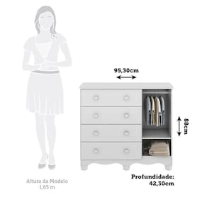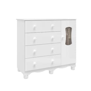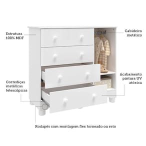 Cômoda de Bebê 1 Porta com Janela e 4 Gavetas 100% MDF Lana Espresso Móveis Branco Brilho. Desenvolvida para oferecer qualidade, beleza, conforto e segurança para toda família na hora de montar o quartinho do(a) bebê. Cômoda produzida com estrutura 100% MDF e acabamento em pintura UV atóxica. Possui 1 porta com janela em PETG Cristal/Acrílico, que permitem visualizar parte interna do móvel, 4 gavetas que deslizam sob corrediças metálicas telescópicas, 1 prateleira que suporta até 5kg, puxadores e pés em plástico. Acompanham o produto, 2 opções de rodapés, um usinado (torneado) e outro reto, para que você escolha no momento da montagem qual se adequa ao estilo do ambiente. Aproveite para adquirir a sua agora!