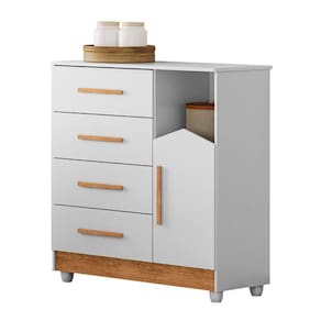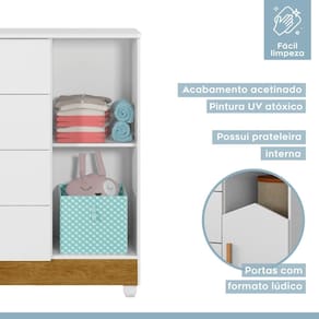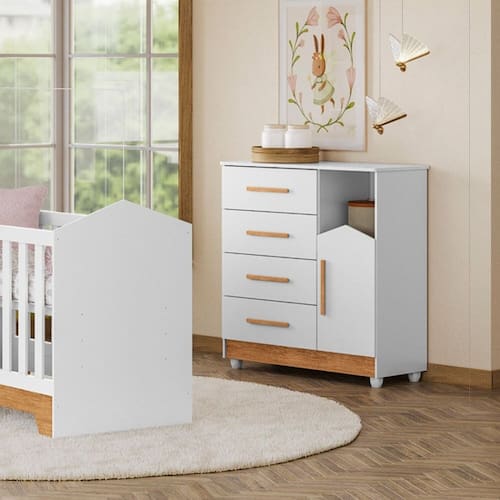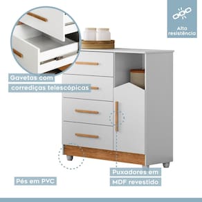 A Cômoda de Bebê 100% MDF 1 Porta 4 Gavetas Duda Tigus Baby é ideal para manter o quarto do seu bebê organizado e elegante. Seu design moderno se adapta perfeitamente a qualquer decoração infantil, enquanto as gavetas com corrediças suaves garantem fácil acesso aos itens. Esta cômoda combina funcionalidade e estilo, sendo uma excelente escolha para o quarto do seu pequeno oferecendo amplo espaço para roupas e acessórios Acabamento da Gaveta: Pintura UV Acabamento da Porta: Pintura UV Acabamento da Prateleira: Pintura UV Acabamento dos Pés: Pintura Altura dos Pés: 6 cm Ambiente Principal: Quarto de Bebê Complexidade da Montagem: Média: pode ser montado por mais de uma pessoa e/ou necessite de maior conhecimento para montagem Cor: Branco/Amadeirado Cor do Produto: Branco/Amadeirado Escala de Brilho: Semi-Brilho Escala de Brilho da Gaveta: Semi-Brilho Escala de Brilho da Porta: Semi-Brilho Escala de Brilho da Prateleira: Semi-Brilho Gaveta com Chave: Não Informações Complementares: Cômoda com 1 porta e 4 gavetas. Possui 1 prateleira. Dobradiças metálicas de pressão. Corrediças telescópicas. Acompanha o jogo de pés que permitem passagem de ventilação por baixo do móvel facilitando a limpeza e evitando acúmulo de pó e pêlos. Itens Inclusos: Parafusos, cavilhas e cantoneiras. Linha ou Coleção: Duda Manual de Montagem e Instalação: https://cdn2.madeiramadeira.com.br/atributo/tigus-baby/2033918-732-17177863403017.pdf Material da Gaveta: MDF Material da Porta: MDF Material da Prateleira: MDF Material do Fundo: MDF Material do Puxador da Gaveta: MDF Material do Puxador da Porta: MDF Material dos Pés: PVC Material Principal: MDF modular: Não Necessita Montagem: Sim Origem do Produto: Nacional Pés Reguláveis: Não Peso: 33,5 kg Peso Máximo por Gaveta: 5 kg Peso Máximo por Prateleira: 10 kg Possui Espelho: Não Possui Nichos: Não Possui Pés: 04 Possui Portas: Sim Possui Prateleiras: Sim Possui Trocador: Não Quantidade de Gavetas: 04 Gavetas Quantidade de Prateleiras: 01 Prateleira Recomendações de Uso, Manutenção e Limpeza: Limpeza com pano macio e levemente umedecido. Não utilizar solventes a base de inflamáveis. Não utilizar produtos abrasivos. Sapatas Niveladoras: Não Sistema de Montagem: Parafusos. Suporta Até (kg): 33,5 kg Tipo de Corrediça da Gaveta: Metálica Telescópica Tipo de Dobradiça/Corrediça da Porta: Metálica Tipo de Puxador da Gaveta: Externo Tipo de Puxador da Porta: Externo