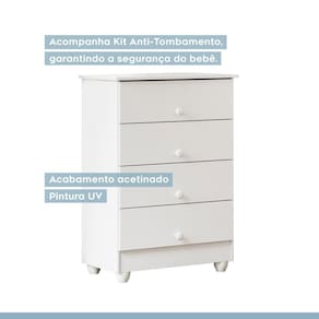 Cômoda de Bebê 100% MDF 4 Gavetas Soft Life Branco. Chega de ter calçados, roupas e objetos pessoais jogados pela casa. Com esta Cômoda Life, seu lar ficará muito mais atraente, organizado e convidativo. Ela possui 4 Gavetas, com um espaço Excelente para você guarda tudo que precisa Não é demais? Aproveite. Ean: 7908167232032