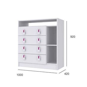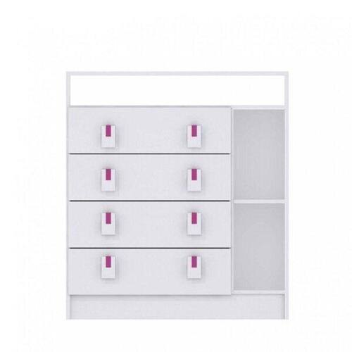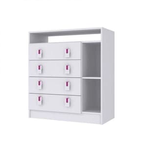 Cômoda de Bebê 4 Gavetas Baby Móveis Percasa Branco/Rosa/Azul. Cômoda para Quarto de Bebê em MDP BP branco 15 mm (nas laterais e prateleiras), acabamento lacca nas frentes de gaveta. Gavetas com corrediça telescópica. Puxador na cor branca com detalhes em branco, rosa e azul. (Já acompanha) Ean: 7898519567366