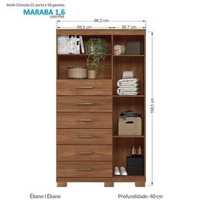 E por falar em organização, ele conta com 06 amplas gavetas com corrediças metálicas, 2 prateleiras externas e uma porta com 3 prateleiras internas.