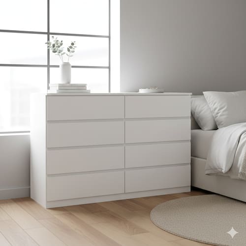 São 8 gavetas disponíveis em um corpo construído a partir de MDP 15 mm, com fita de borda em papel e sapatas na base. Suas gavetas contam com 60 centímetros de largura, dando amplo espaço para guardar as roupas dobradas e bem dispostas nela. Tudo com a facilidade de puxadores embutidos e corrediças telescópicas, que garantem um deslizar suave e sem batidas, além do acabamento em pintura UV, preservando a vida útil do móvel.