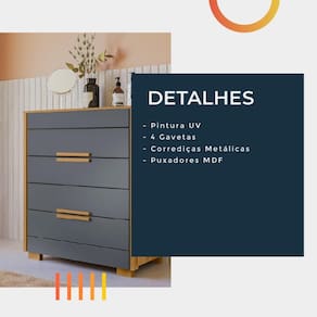 A Cômoda Dhara é perfeita para você que procura praticidade e organizaçãopara o seu quarto. Preparadapara acomodar seusacessórios, pertences, e roupas com muita praticidade. Com seu designer sofisticado contémquatrogavetas com corrediças telescópica,e seus puxadores em MDF,e pésque oferecemsustentação, e distanciamento do chão.