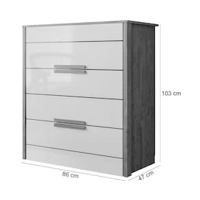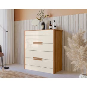 Características Estrutura em MDP de 15mm. Pintura em acabamento UV. 04 Gavetas com corrediças telescópicas. Puxadores em MDF. Pés em PVC. Molduras laterais de 25mm.