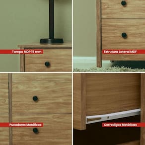 CARACTERÍSTICAS- Produzido em MDP de 15 mm com revestimento em pintura UV fosca.- A base superior suporta até 30 kg.- Possui 6 gavetas que suportam até 5 kg cada.- Puxadores e corrediças metálicas.