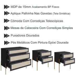 Conjunto De 01 Cômoda e 02 Mesas de Cabeceira, Linha Oslo Artesano. Traz como característica um traço artesanal, acolhedor e sofisticado. Estrutura em MDP de 15mm, acabamento em pintura BP e Pés de tubo metálico em aço com pintura epóxi na cor dourada. A Cômoda possui gavetas com corrediças telescópicas garantindo um abre e fecha leve e suave, as mesas de cabeceira possuem gavetas corrediças simples, os puxadores são de poliestireno na cor Dourado, conta com aplique palhinha de tela sintética (PVC com poliéster), que é fixada na parte externa das gavetas, as extremidades dos pés possuem ponteiras plásticas para evitar atrito do móvel com o piso, a cômoda tem sistema anti-tombamento, afim de evitar acidentes, móveis com design escandinavo minimalista, é a opção ideal para um ambiente com toque sofisticado e ao mesmo tempo aconchegante. Mais produtos da Linha Oslo, você encontra em nosso site, podendo fazer a composição completa para sua casa, são diversos itens com design prático e funcional para tornar a vida mais facil e a casa mais alegre. Estes móveis chegarão em sua casa separados em 06 volumes.