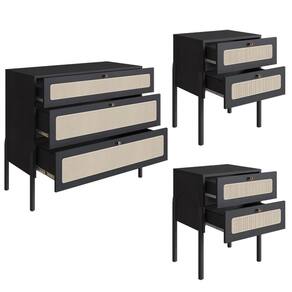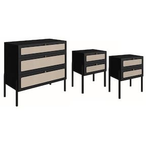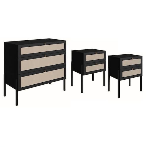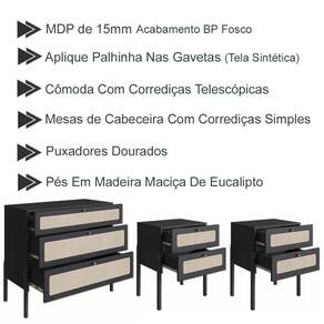 Conjunto De 01 Cômoda e 02 Mesas de Cabeceira, Linha Oslo Artesano. Traz como característica um traço artesanal, acolhedor e sofisticado. Possui estrutura em MDP de 15mm, pés palitos em madeira maciça de eucalipto garantindo ótima estabilidade e firmeza, acabamento em pintura BP. A Cômoda possui gavetas com corrediças telescópicas garantindo um abre e fecha leve e suave, as mesas de cabeceira possuem gavetas corrediças simples, os puxadores são de poliestireno na cor Dourado, conta com aplique palhinha de tela sintética (PVC com poliéster), que é fixada na parte externa das gavetas, as extremidades dos pés possuem sapatas emborrachadas para evitar atrito do móvel com o piso, a cômoda tem sistema anti-tombamento, afim de evitar acidentes, móveis com design escandinavo minimalista, é a opção ideal para um ambiente com toque sofisticado e ao mesmo tempo aconchegante. Mais produtos da Linha Oslo, você encontra em nosso site, podendo fazer a composição completa para sua casa, são diversos itens com design prático e funcional para tornar a vida mais facil e a casa mais alegre. Estes móveis chegarão em sua casa separados em 06 volumes.