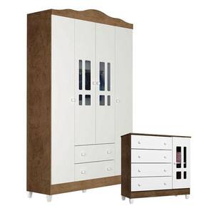 Cômoda e Guarda Roupa Infantil Ariel 4 Portas Branco Acetinado Amadeirado - Carolina