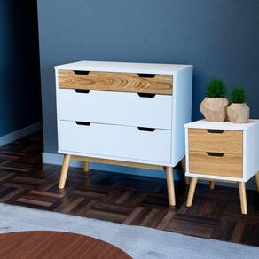 Conjunto de móveis modernos, compostos 100% em pinus de reflorestamento legal com ótima qualidade. Com pés palito estilo retrô, móvel na cor branca, com detalhes em cera em uma das frentes de gavetas, nas travessas e nos pés que dão um toque especial. O puxador é fresado na gaveta, dando um charme a mais para o item. As gavetas possuem corrediças roldana de 300mm. Embalado em caixa de papelão onda dupla com reforços internos para proteger o produto durante o transporte. Produto de fácil montagem que acompanha guia de montagem para lhe ajudar! Produto versátil que combina com qualquer ambiente da sua casa.